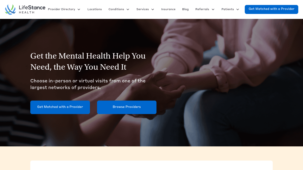LifeStance Health runs in-person and virtual mental health clinics with psychiatrists, psychiatric nurse practitioners, and therapists across multiple states. The service handles medication management and therapy for various mental health conditions.