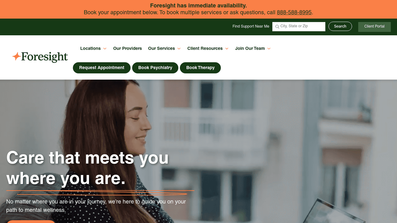 Foresight Mental Health provides virtual and in-person mental health care in Arizona, California, Florida, Georgia, and Texas. The service connects patients with licensed therapists for psychotherapy and board-certified psychiatric providers for medication management.