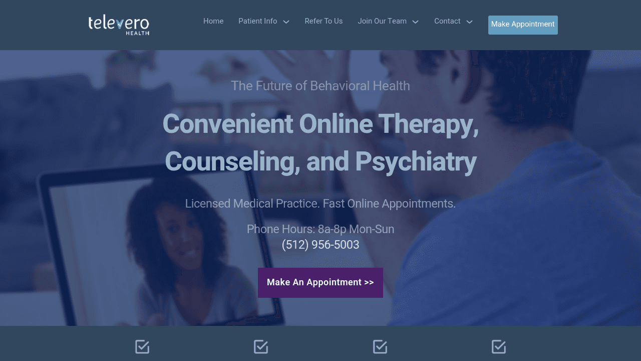 Televero Health is a fully remote mental health provider serving patients throughout Texas and Florida. The practice offers psychiatry services for medication management, therapy, and counseling. Televero Health treats a wide range of patients, which allows the practice to manage behavioral health needs across the lifespan, from pediatric care to geriatric psychiatry.